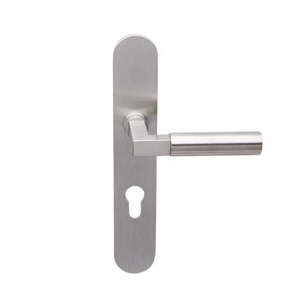 Deurkruk Bauhaus matnikkel op ovaal geveerd schild met cilindergat