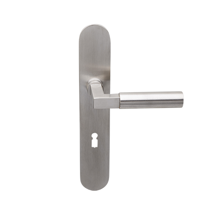 Deurkruk Bauhaus matnikkel op ovaal geveerd schild met sleutelgat