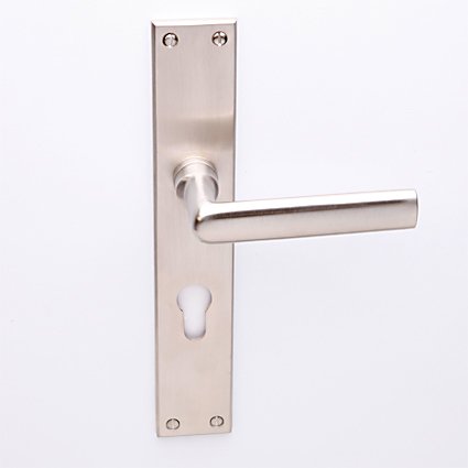 Deurkruk Poelzig matnikkel op Bauhaus schild met cilindergat