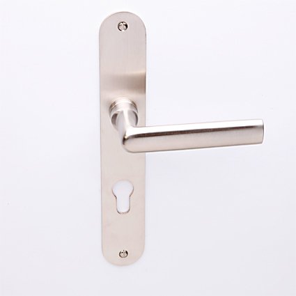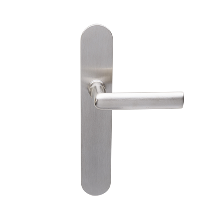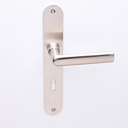 Deurkruk Poelzig matnikkel op ovaalschild met cilindergat