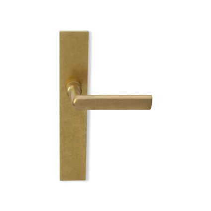 Deurkruk Poelzig oud messing op haaks geveerd schild blind