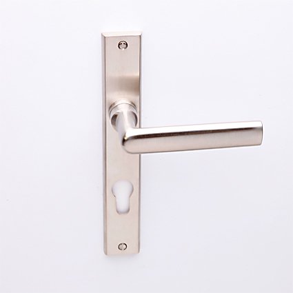 Deurkruk Poelzig matnikkel op ovaalschild met cilindergat