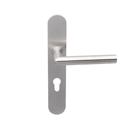 Deurkruk Berlin matnikkel op ovaal geveerd schild met cilindergat