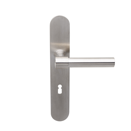 Deurkruk Weimar L-model matnikkel op ovaal geveerd schild met sleutelgat