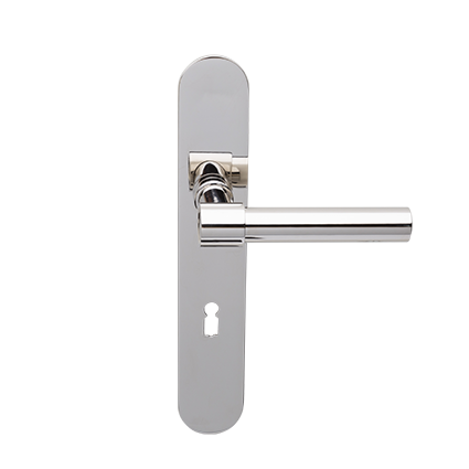 Deurkruk Weimar L-model nikkel op ovaal geveerd schild met sleutelgat