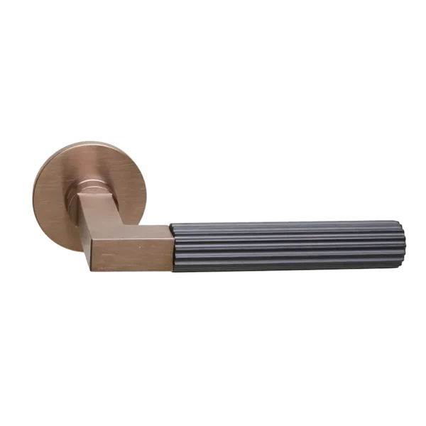 Deurkruk uit de modulaire serie bestaand uit basisstuk Bauhaus met mat bronzen PVD coating samen met handvat Linear ( “Linear” tandwiel patroon) met Carbon PVD coating . Deurkrukken worden per paar op dunne ronde blind gemonteerde geveerde rozetten geleverd.