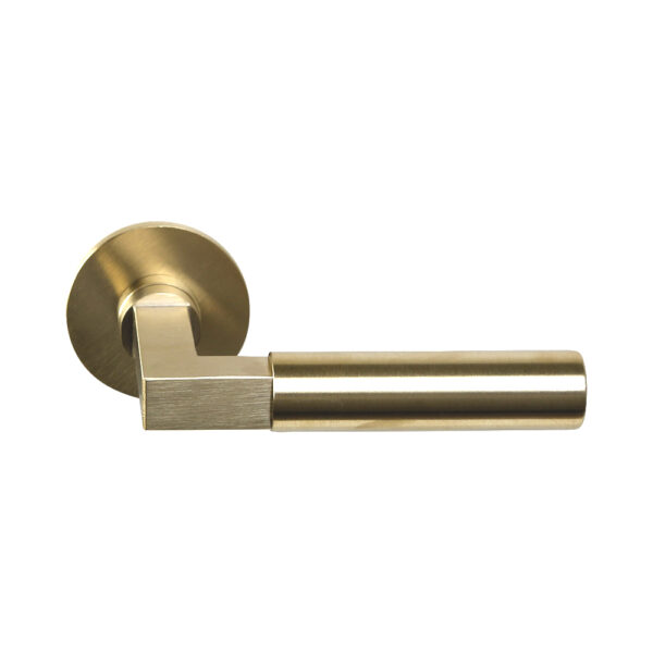 Deze bekende deurkrukken in Bauhaus stijl met mat gouden PVD coating worden per paar op dunne ronde geveerde rozetten geleverd