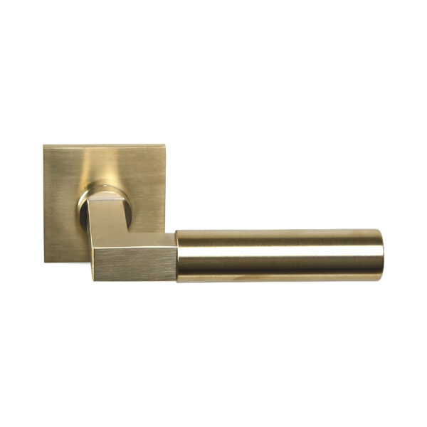 Deze bekende deurkrukken in Bauhaus stijl met mat gouden PVD coating worden per paar op dunne vierkante geveerde rozetten geleverd