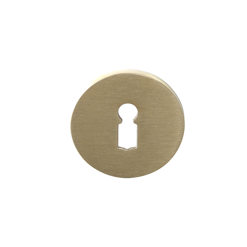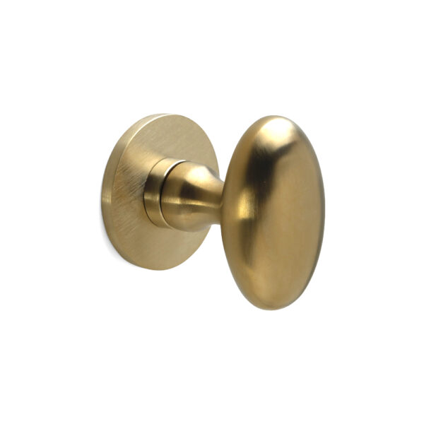Knopkruk ei-vormig op dunne ronde geveerde rozetten in matgoud PVD. Deze ovale knoppen functioneren als deurkrukken en worden per paar verkocht.