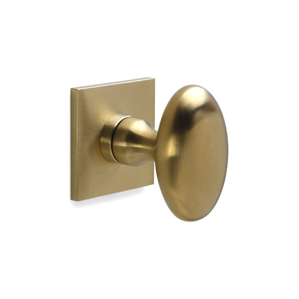 Knopkruk ei-vormig op dunne vierkante geveerde rozetten in matgoud PVD. Deze ovale knoppen functioneren als deurkrukken en worden per paar verkocht.