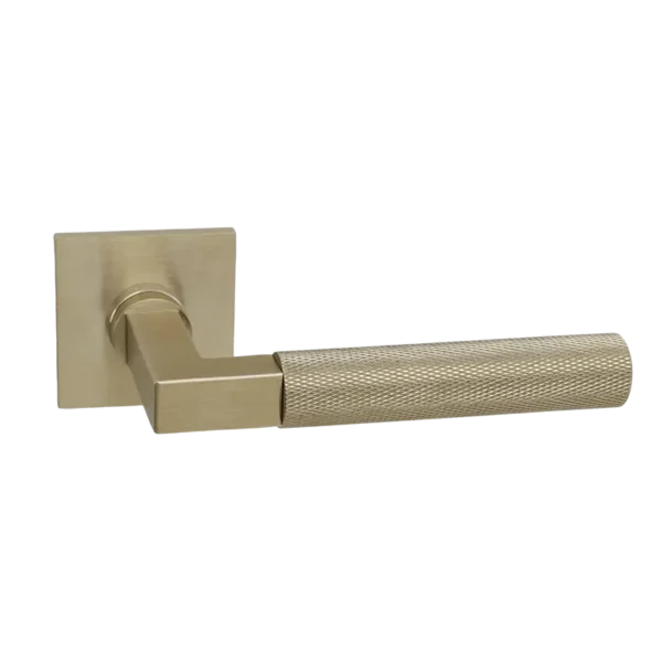 Deurkruk uit de modulaire serie bestaand uit basisstuk Bauhaus met handvat Struktur ( “Diamant Cut” ruitjes patroon) met mat gouden PVD coating. Deurkrukken worden per paar op dunne vierkante blind gemonteerde geveerde rozetten geleverd.