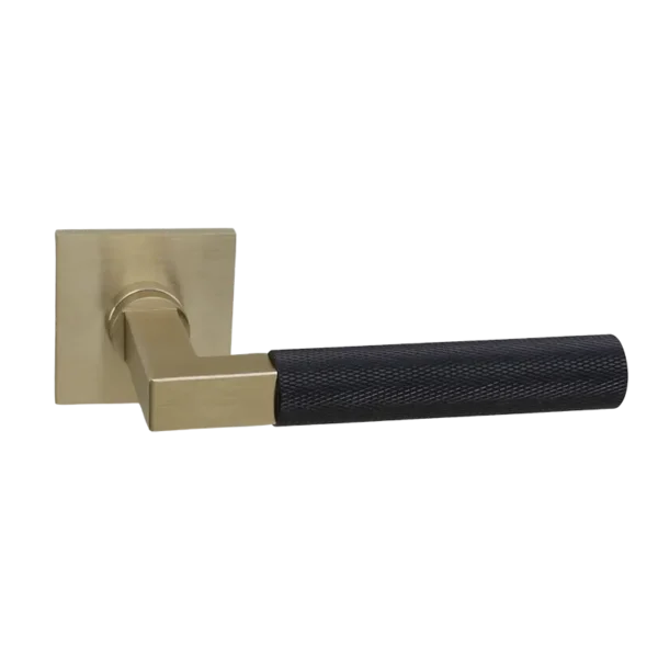 Deurkruk uit de modulaire serie bestaand uit basisstuk Bauhaus met mat gouden PVD coating samen met handvat Struktur ( “Diamant Cut” ruitjes patroon) met carbon PVD coating . Deurkrukken worden per paar op dunne vierkante blind gemonteerde geveerde rozetten geleverd.