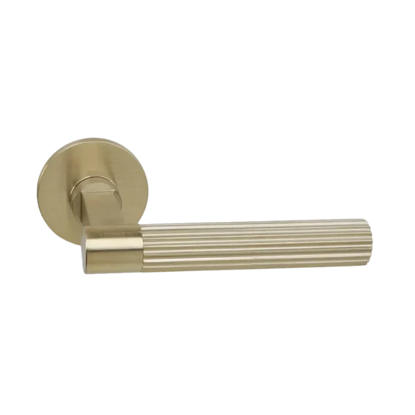 Deurkruk uit de modulaire serie bestaand uit basisstuk Bruxelles met handvat Linear ( “Linear” tandwiel patroon) met mat gouden PVD coating. Deurkrukken worden per paar op dunne ronde blind gemonteerde geveerde rozetten geleverd.