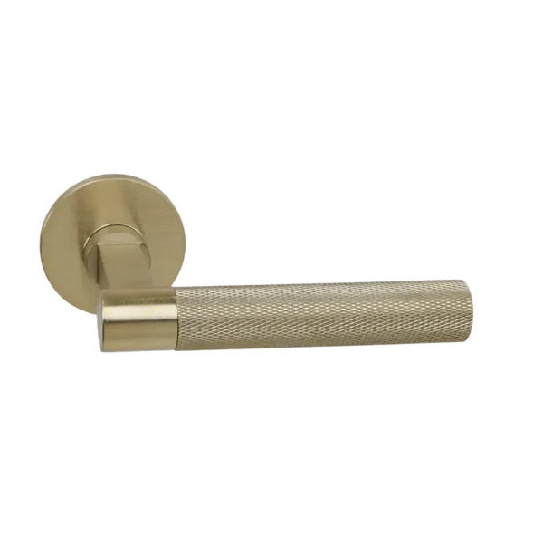 Deurkruk uit de modulaire serie bestaand uit basisstuk Bruxelles met handvat Struktur ( “Diamant Cut” ruitjes patroon) met mat gouden PVD coating. Deurkrukken worden per paar op dunne ronde blind gemonteerde geveerde rozetten geleverd.