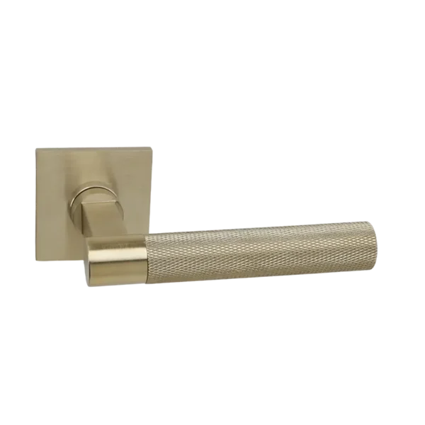 Deurkruk uit de modulaire serie bestaand uit basisstuk Bruxelles met handvat Struktur ( “Diamant Cut” ruitjes patroon) met mat gouden PVD coating. Deurkrukken worden per paar op dunne vierkante blind gemonteerde geveerde rozetten geleverd.