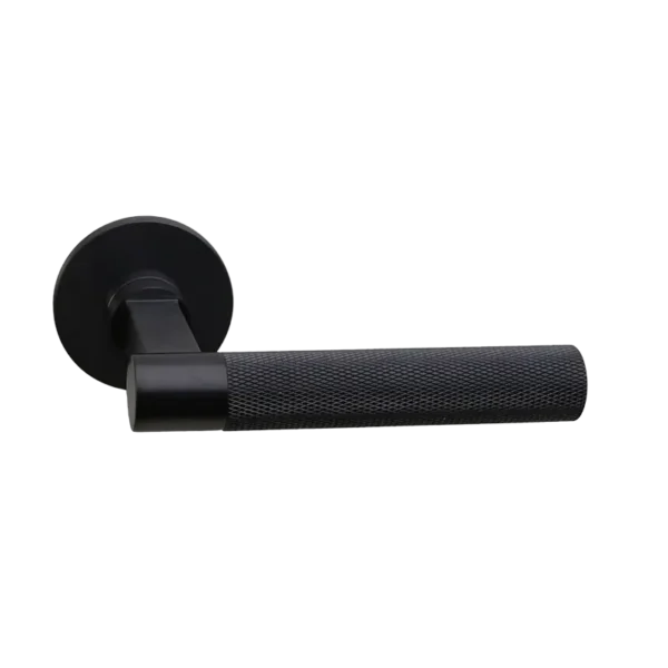Deurkruk uit de modulaire serie bestaand uit basisstuk Bruxelles met handvat Struktur ( “Diamant Cut” ruitjes patroon) met carbon PVD coating. Deurkrukken worden per paar op dunne ronde blind gemonteerde geveerde rozetten geleverd.