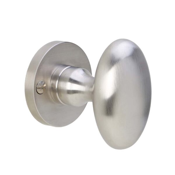 Knopkruk ei-vormig op ronde rozetten in matnikkel. Deze ovale knoppen functioneren als deurkrukken en worden per paar verkocht.