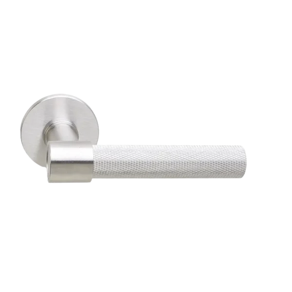 Deurkruk uit de modulaire serie bestaand uit basisstuk Weimar met handvat Struktur ( “Diamant Cut” ruitjes patroon) in matnikkel. Deurkrukken worden per paar op dunne ronde blind gemonteerde geveerde rozetten geleverd.