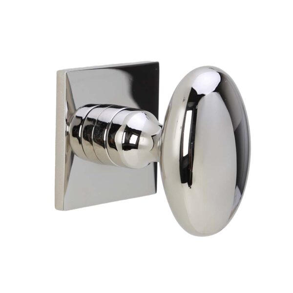 Knopkruk ei-vormig op dunne vierkante geveerde rozetten in hoogglans nikkel. Deze ovale knoppen functioneren als deurkrukken en worden per paar verkocht.