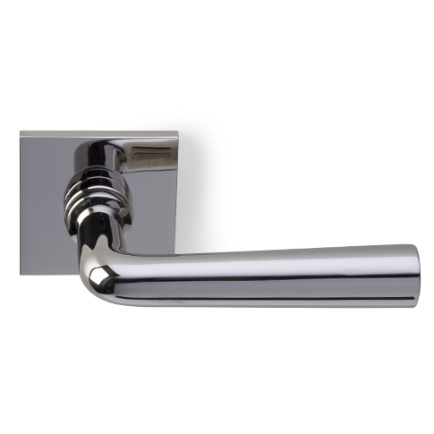 Deze verfijnde deurkrukken in Bauhaus stijl worden per paar op vierkante dunne geveerde rozetten geleverd