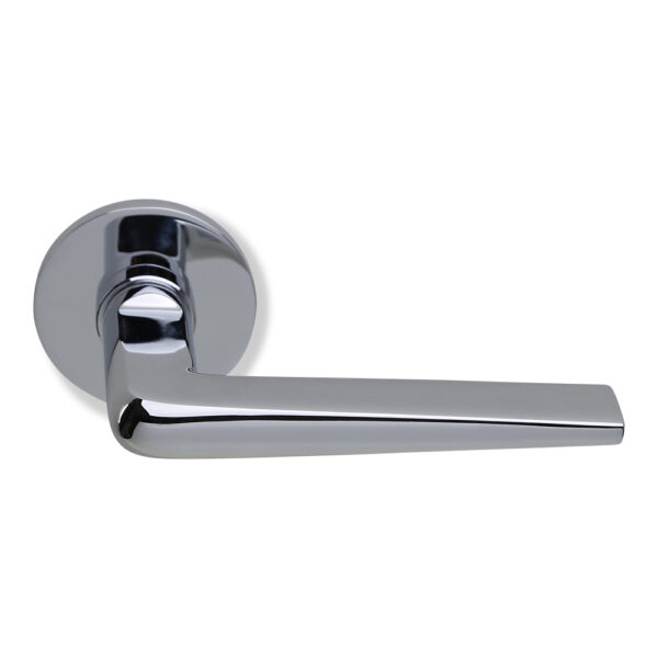 Deze bijzonder verfijnde deurkrukken van Max Burchartz worden per paar op dunne geveerde ronde rozetten met doorgaande montage geleverd