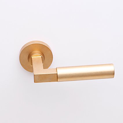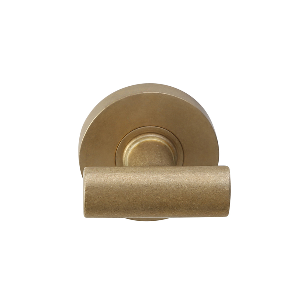 Deurkruk Bauhaus oud messing op geveerd rond rozet