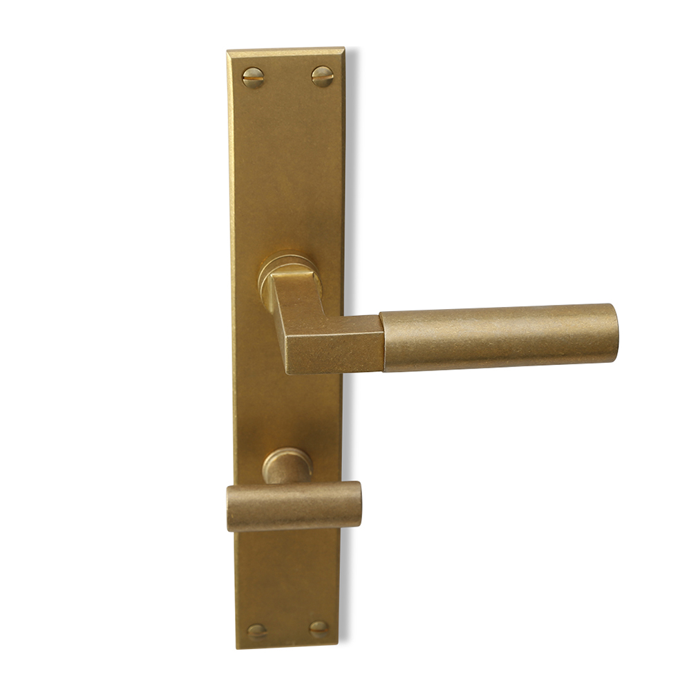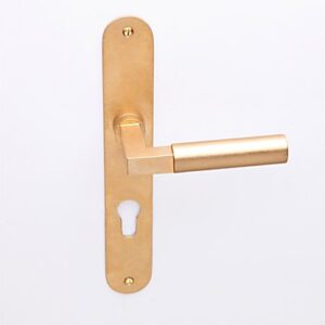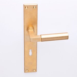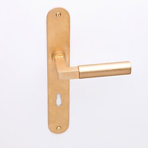 Deurkruk Poelzig oud messing op Bauhaus schild met sleutelgat