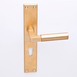 Deurkruk Poelzig oud messing op Bauhaus schild met cilindergat