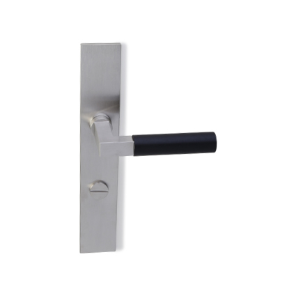 Bekende deurkrukken in Bauhaus stijl. Idem als op haaks blind geveerd schild, maar dan met een toilet/badkamersluiting, afstand midden krukgat tot midden slot, stift 8mm. Wegens het ebbenhout niet geschikt voor buitengebruik.