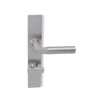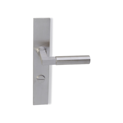 Bekende deurkrukken in Bauhaus stijl. Idem als op haaks blind geveerd schild, maar dan met een toilet/badkamersluiting, afstand midden krukgat tot midden slot, stift 8mm