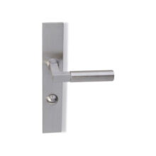 Bekende deurkrukken in Bauhaus stijl. Idem als op haaks blind geveerd schild, maar dan met een toilet/badkamersluiting, afstand midden krukgat tot midden slot, stift 8mm