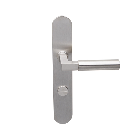 Bekende deurkrukken in Bauhaus stijl. Idem als op ovaal blind geveerd schild, maar dan met een toilet/badkamersluiting, afstand midden krukgat tot midden slot, stift 8mm