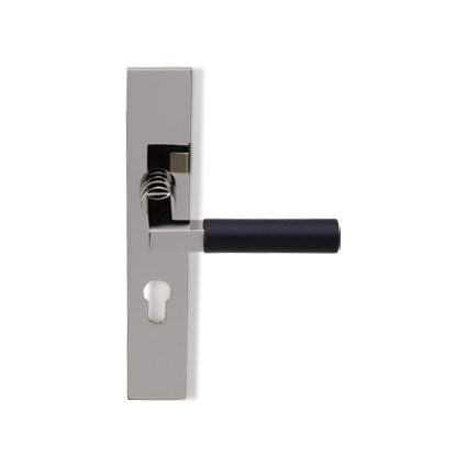 Bekende deurkrukken in Bauhaus stijl. Idem als op haaks blind geveerd schild maar dan met een cilinderuitsparing, afstand midden krukgat tot midden cilindergat. Wegens het ebbenhout niet geschikt voor buitengebruik.