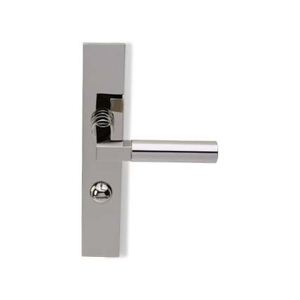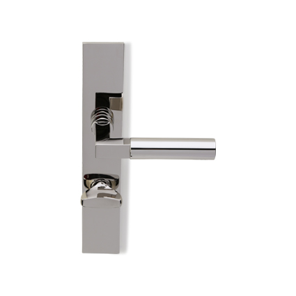 Bekende deurkrukken in Bauhaus stijl. Idem als op haaks blind geveerd schild, maar dan met een toilet/badkamersluiting, afstand midden krukgat tot midden slot, stift 8mm