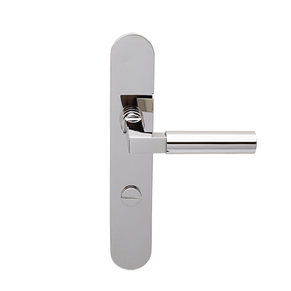Bekende deurkrukken in Bauhaus stijl. Idem als op ovaal blind geveerd schild, maar dan met een toilet/badkamersluiting, afstand midden krukgat tot midden slot, stift 8mm