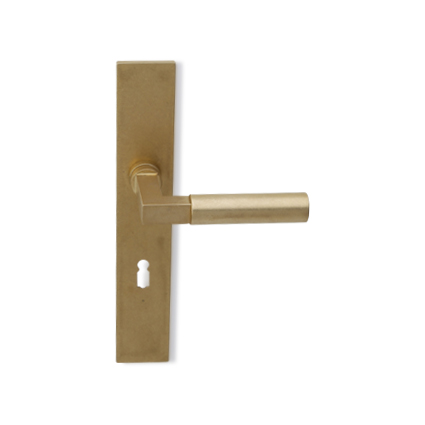 Deurkruk Bauhaus oud messing op haaks geveerd schild met sleutelgat