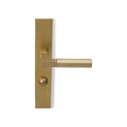 Bekende deurkrukken in Bauhaus stijl. Idem als op haaks blind geveerd schild, maar dan met een toilet/badkamersluiting, afstand midden krukgat tot midden slot, stift 8mm
