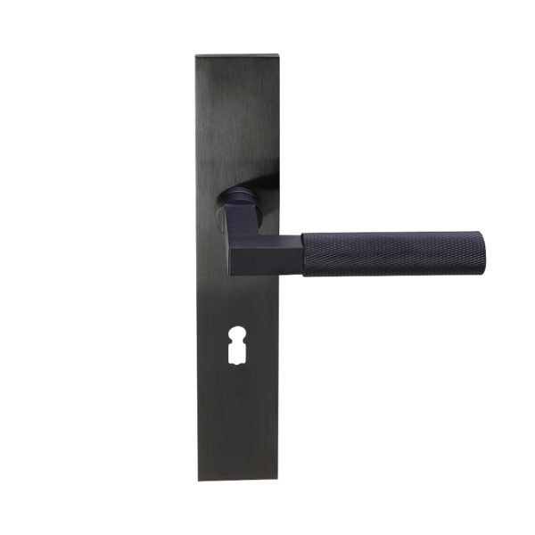Bekende deurkrukken in Bauhaus stijl met ruitjes patroon in het handvat. Idem als op haaks blind geveerd schild maar dan met een sleuteluitsparing, afstand midden krukgat tot midden sleutelgat.