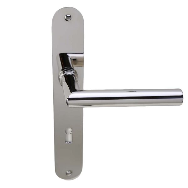 Idem als op ovaal schild blind maar dan met een sleuteluitsparing, afstand midden krukgat tot midden sleutelgat.