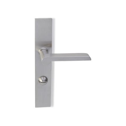 Elegante jaren 30 deurkrukken in Bauhaus stijl. Idem als op haaks blind geveerd schild, maar dan met een toilet/badkamersluiting, afstand midden krukgat tot midden slot, stift 8mm