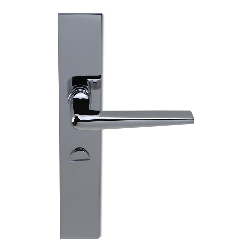 Bijzondere verfijnde deurkrukken van Max Burchartz. Idem als op haaks blind geveerd schild, maar dan met een toilet/badkamersluiting, afstand midden krukgat tot midden slot, stift 8mm