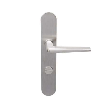 Bijzondere verfijnde deurkrukken van Max Burchartz. Idem als op ovaal blind geveerd schild, maar dan met een toilet/badkamersluiting, afstand midden krukgat tot midden slot, stift 8mm
