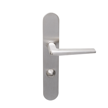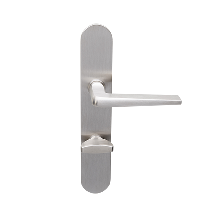 Bijzondere verfijnde deurkrukken van Max Burchartz. Idem als op ovaal blind geveerd schild, maar dan met een toilet/badkamersluiting, afstand midden krukgat tot midden slot, stift 8mm