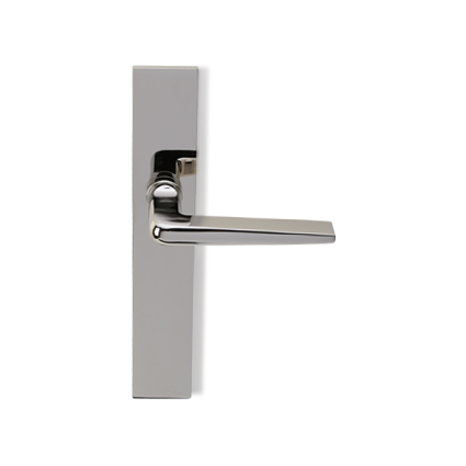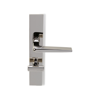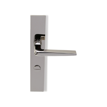 Bijzondere verfijnde deurkrukken van Max Burchartz. Idem als op haaks blind geveerd schild, maar dan met een toilet/badkamersluiting, afstand midden krukgat tot midden slot, stift 8mm