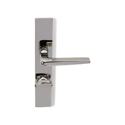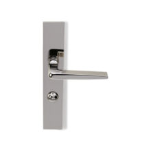 Bijzondere verfijnde deurkrukken van Max Burchartz. Idem als op haaks blind geveerd schild, maar dan met een toilet/badkamersluiting, afstand midden krukgat tot midden slot, stift 8mm