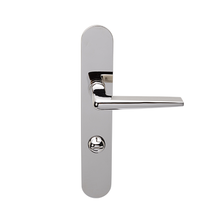 Bijzondere verfijnde deurkrukken van Max Burchartz. Idem als op ovaal blind geveerd schild, maar dan met een toilet/badkamersluiting, afstand midden krukgat tot midden slot, stift 8mm