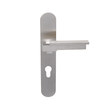Deurkruk Dessau matnikkel op ovaal geveerd schild met cilindergat