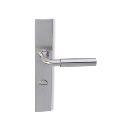 Subtiele jaren 30 deurkrukken in Bauhaus stijl. Idem als op haaks blind geveerd schild, maar dan met een toilet/badkamersluiting, afstand midden krukgat tot midden slot, stift 8mm.
