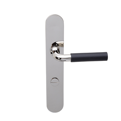 Subtiele jaren 30 deurkrukken in Bauhaus stijl. Idem als op ovaal blind geveerd schild, maar dan met een toilet/badkamersluiting, afstand midden krukgat tot midden slot, stift 8mm. Wegens het ebbenhout niet geschikt voor buitengebruik.