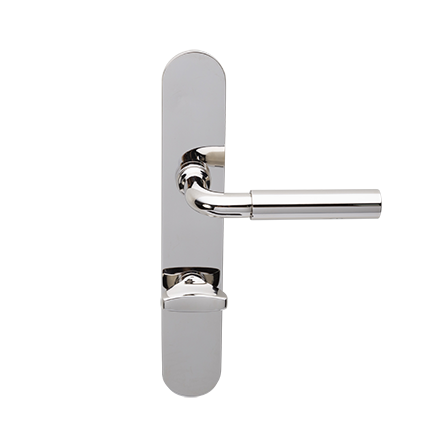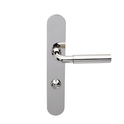 Subtiele jaren 30 deurkrukken in Bauhaus stijl. Idem als op ovaal blind geveerd schild, maar dan met een toilet/badkamersluiting, afstand midden krukgat tot midden slot, stift 8mm.